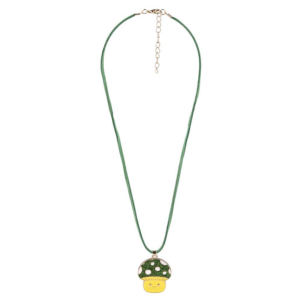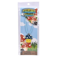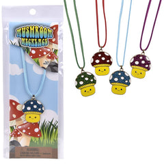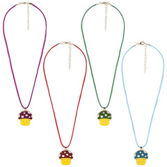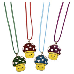 Necklace with an mushroom-inspired pendant Assorted colors Each piece on a back card Sold by the dozen in a poly bag