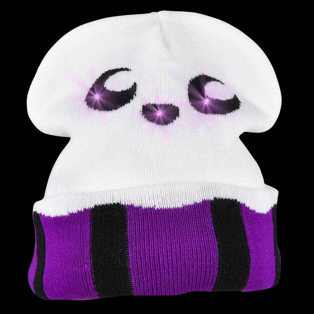 • Ghost-themed beanie • Lights up with 3 different settings • Batteries included but nonreplaceable • Sold by the piece with a tag • Ages 3+