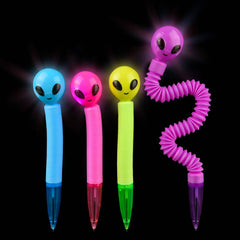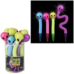 Light-up alien-themed pop tubes great for fidgety hands Assorted colors Batteries included but nonreplaceable 12 pieces sold in a PVC canister