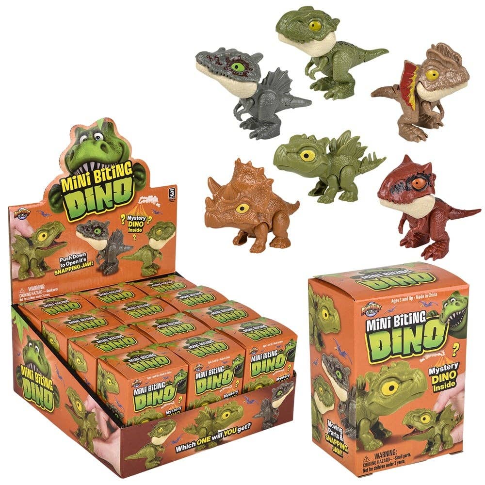 • Dinosaur figures that "bite" with the push of a button • Assorted styles • Each piece is in a box • Sold by the dozen in a display • Ages 3+