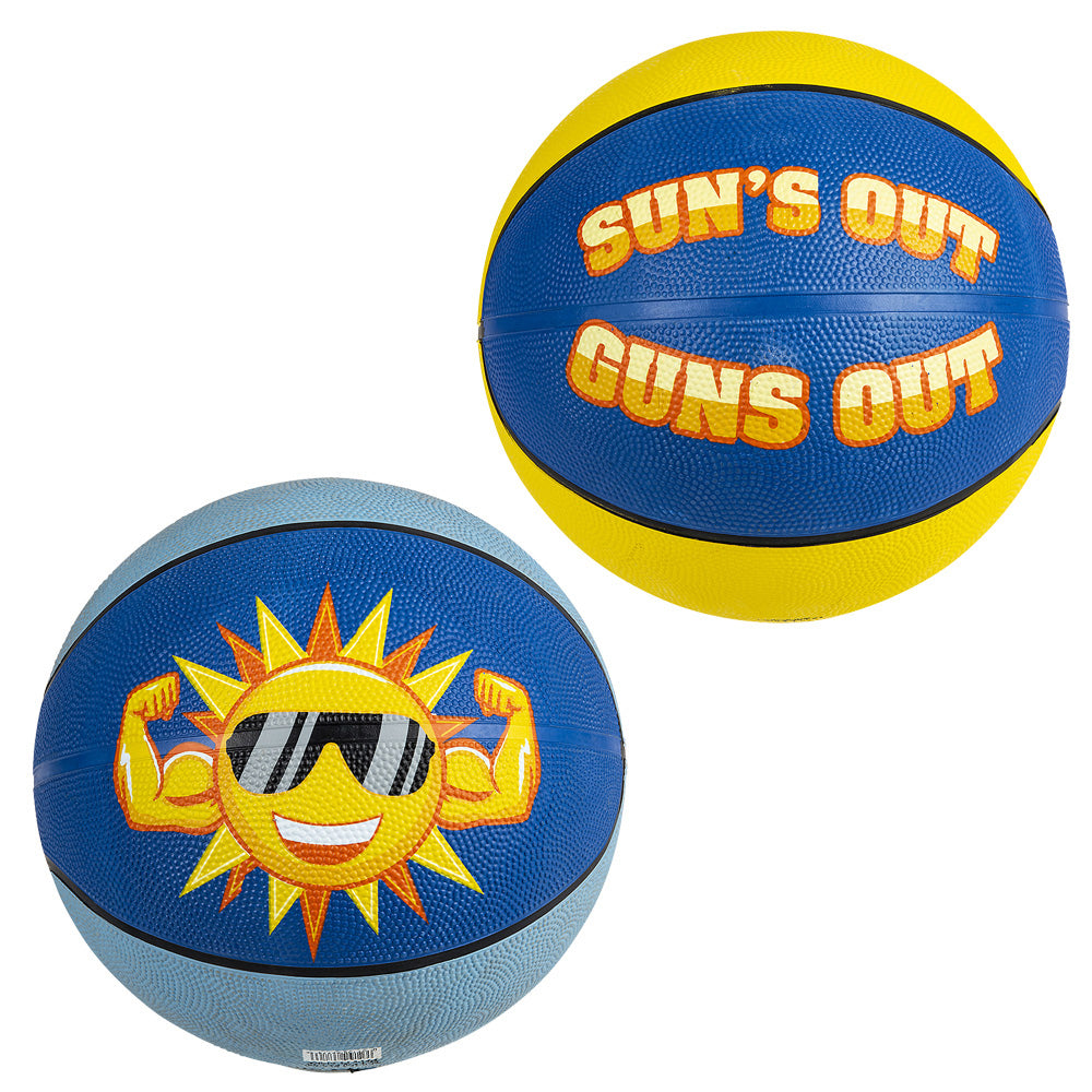 7’’ Suns Out Basketball Sun with muscles design Perfect for outdoor activities Unique game prize Sold deflated Sold by the piece Packaged in a polybag