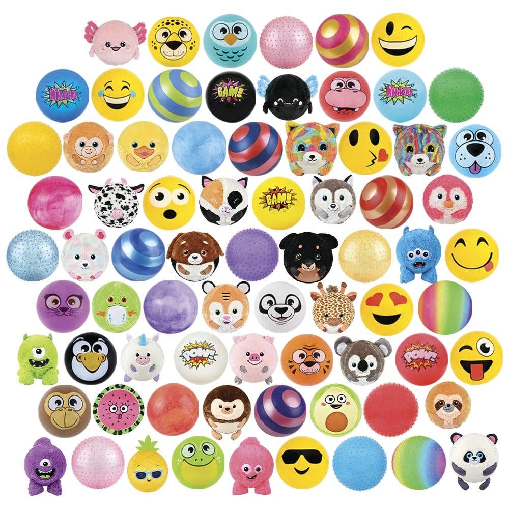 • Plush bladder balls and vinyl balls in a mix of assorted food and animals