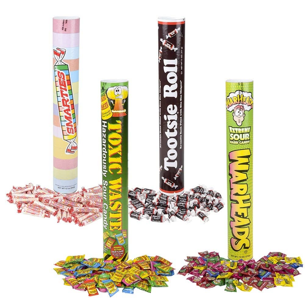 • Variety of mega tubes filled with candy • Assorted candies • 12 pieces sold in a case • Nonreturnable • Ages 3+