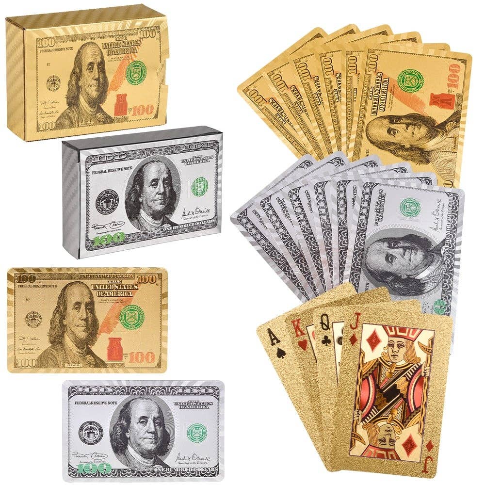 • Gold and Silver foil playing cards with a $100 bill print back design