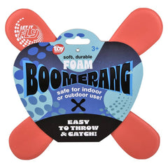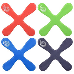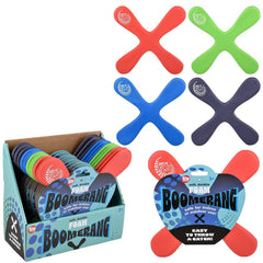 Foam x-shaped boomerangs great for outdoor and indoor play Assorted colors Each piece is on a card Sold by the dozen in a display