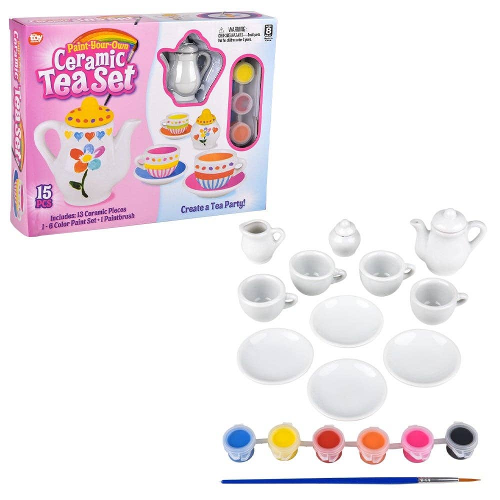 • The set includes a ceramic teapot, tea cups, plates, creamer, sugar bowl, 6 paints, and a paintbrush