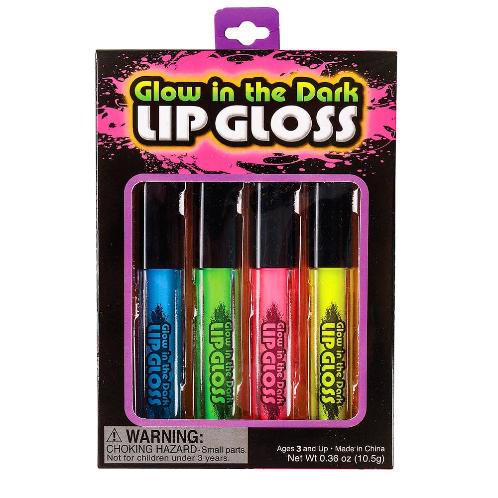 • Lip gloss that glows in the dark • Assorted colors • 4 lip glosses in each set • Sold by the set in a printed box • Ages 3+