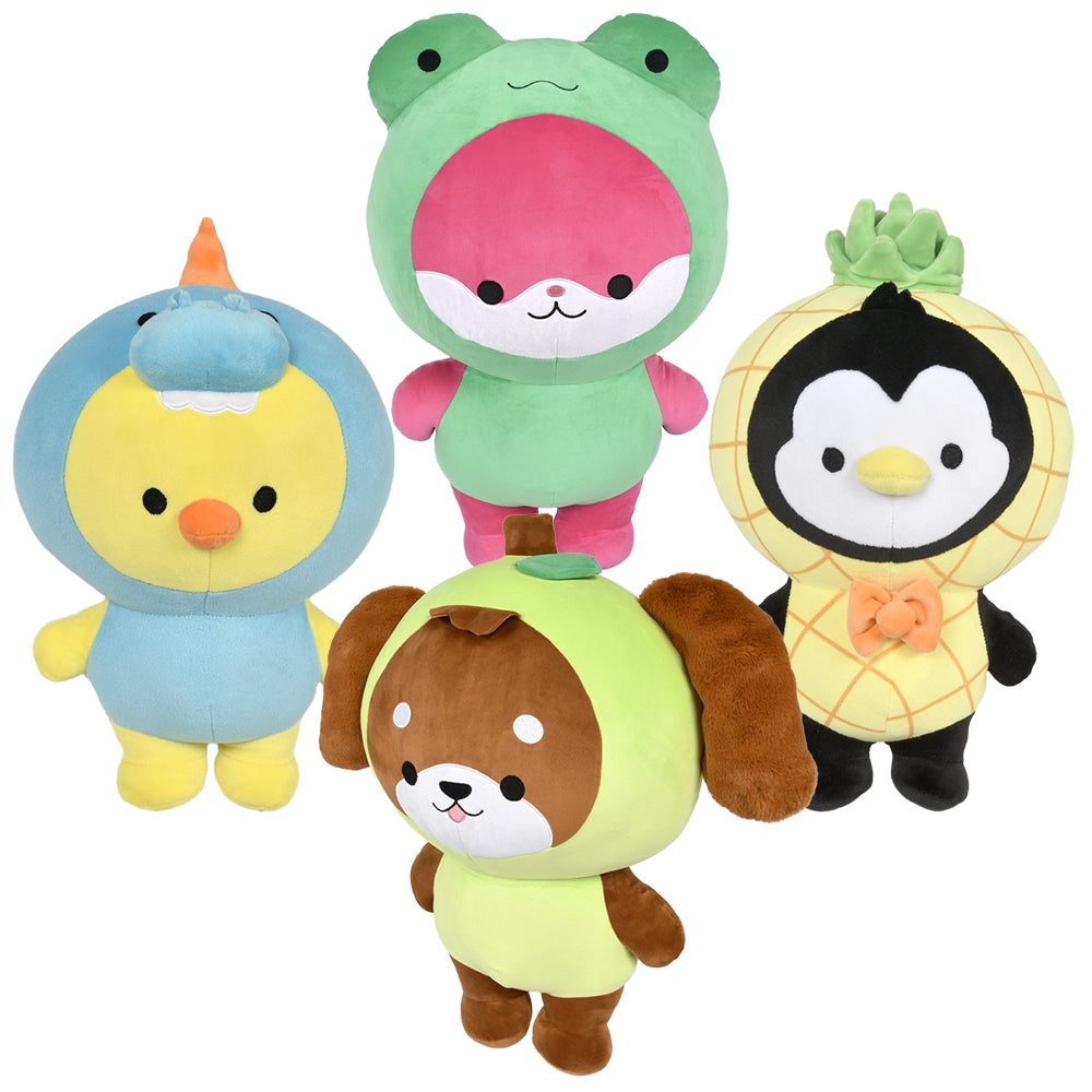 • 24" animal kawaii plush in outfits • Sold by the piece • Assorted colors • Each with a hang tag • Ages 0+