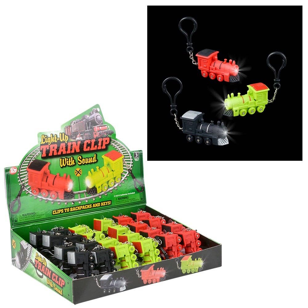 • 2" Light-up Train Back Pack Clip With Sound • Plastic • Pull-Back action • Packaged in a display box • 24 pieces per unit • Ages 3+