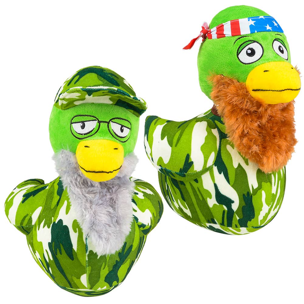 • Duck plush with camo gear and beards • Great carnival prize options • Assorted styles • Sold by the piece with a hang tag • Ages 5+