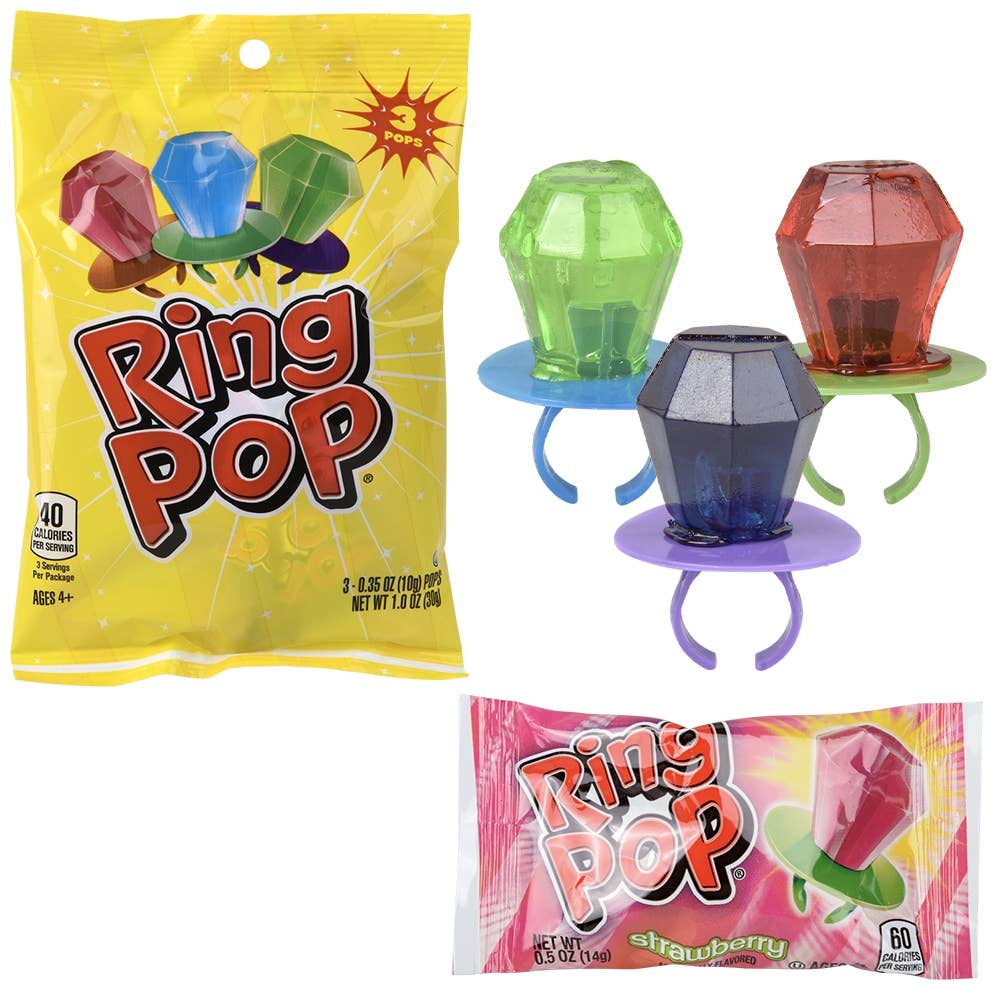 • Classic Ring Pop Candy • Assorted flavors • Sold by the case, each in a printed bag • Ages 3+