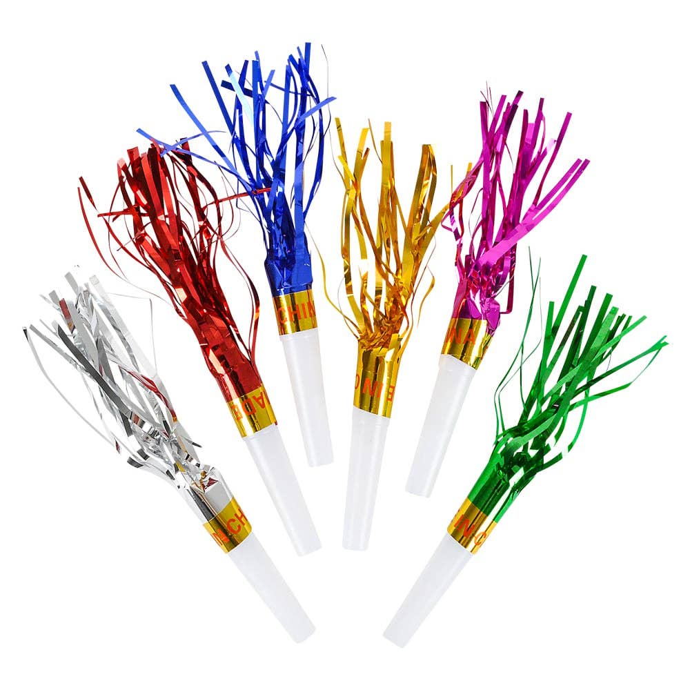 • Noisemakers with fringes on the end • Great for parties • Assorted colors • 144 pieces sold in a poly bag • Ages 3+