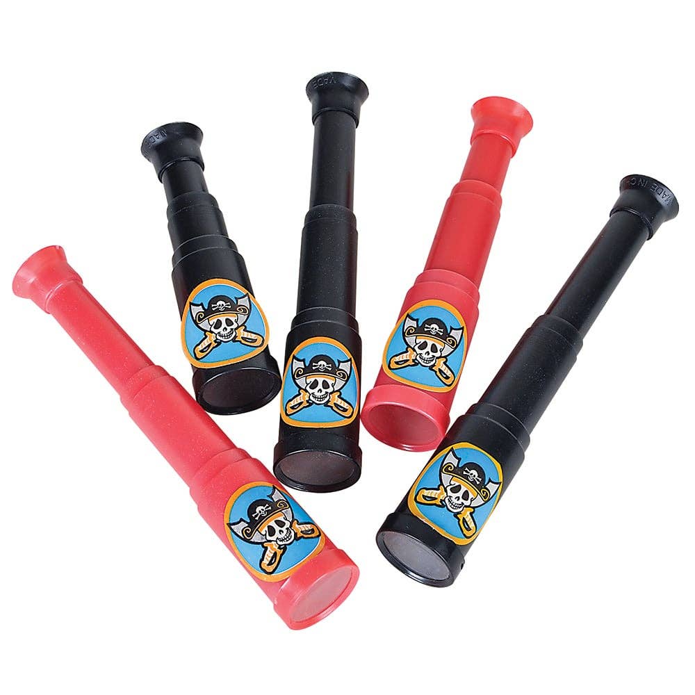 • Pirate-themed toy telescopes that are collapsible • Great prize selection options • Assorted colors • Sold by the dozen in a poly bag • Ages 3+