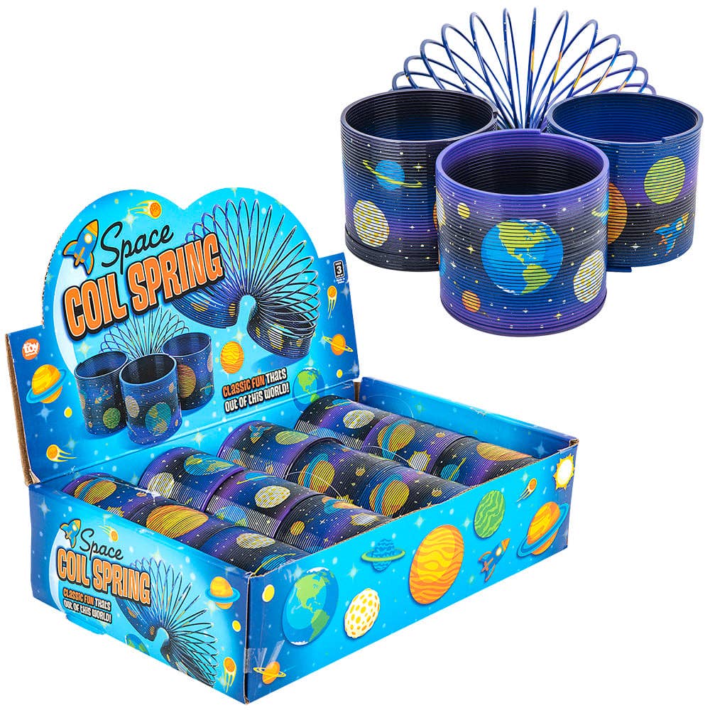 • Coil springs with a space print design • Each piece comes with a hang tag • Sold by the display • 12 pieces per display • Ages 3+