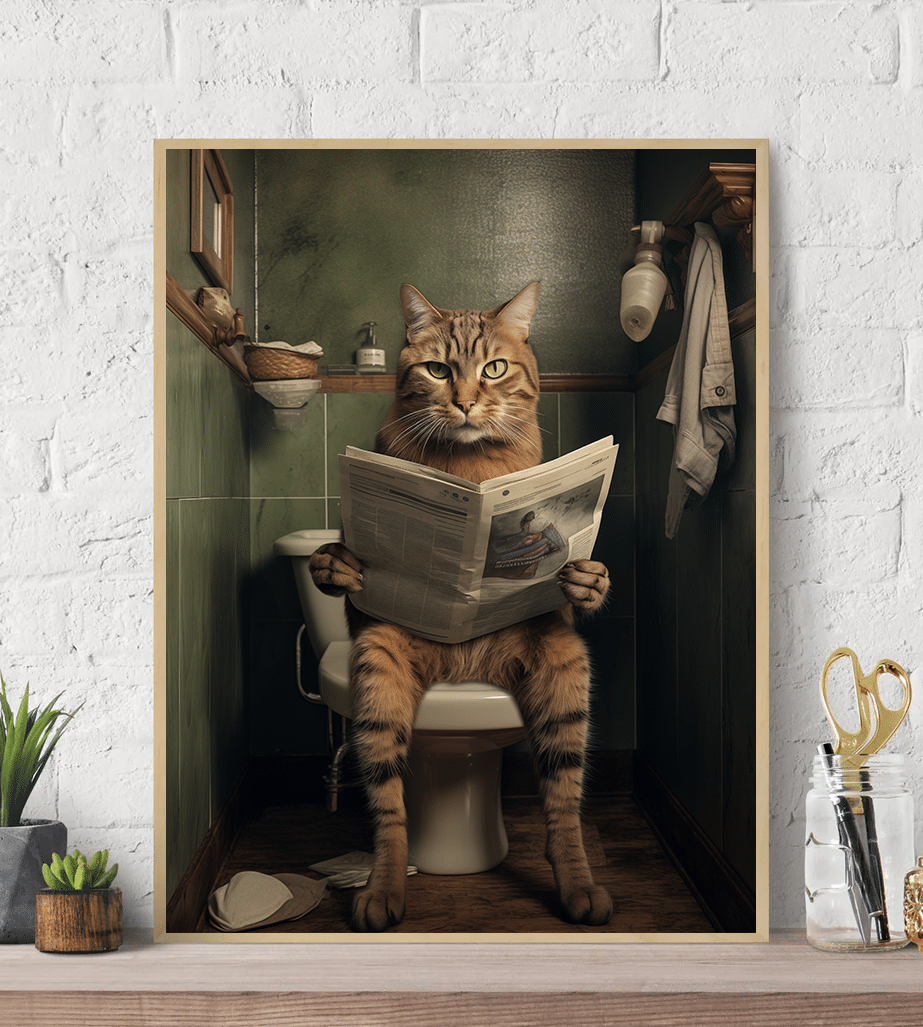 This imaginative canvas print features a cat in a humorous human-like scenario, seated on a toilet and casually reading a newspaper. The setting is a cozy bathroom with vintage vibes, from the green walls to the wooden accents. The cat's expression is one of nonchalance, adding a playful twist to the typical morning routine.