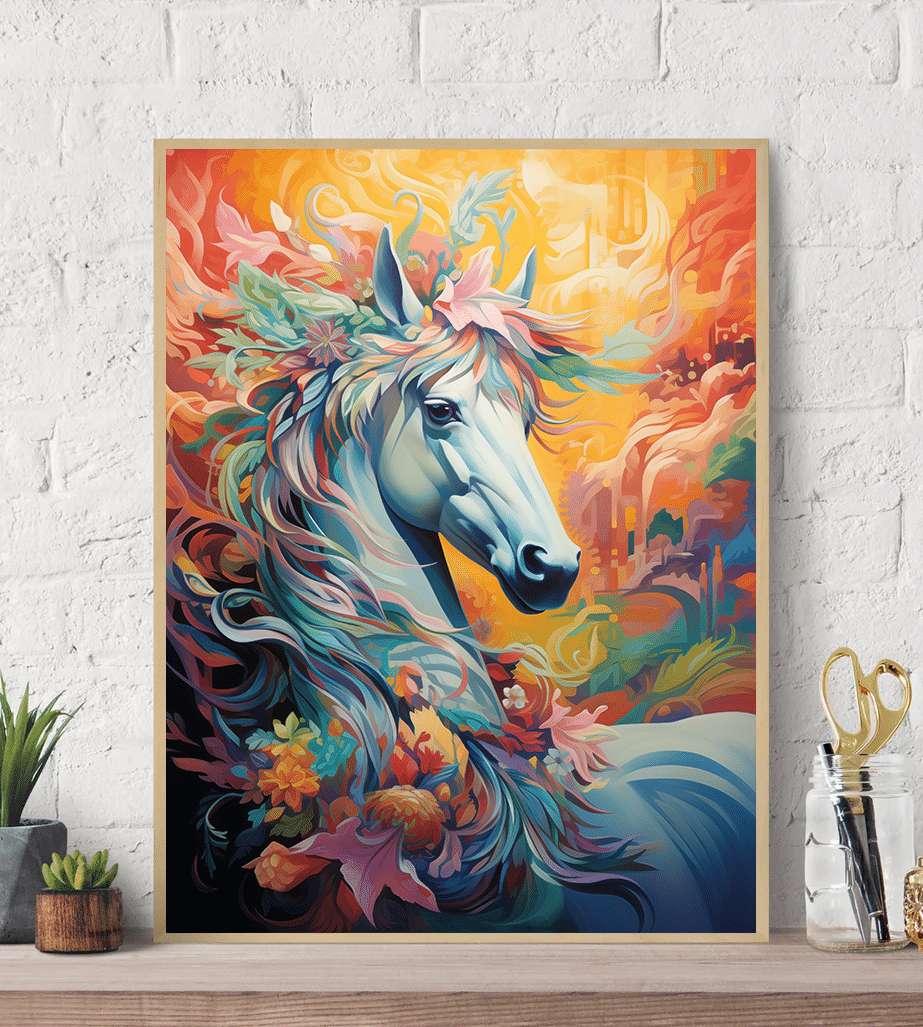 Dive into the vibrant world of canvas art with this visually stunning canvas wall art print, an instant favorite for any art lover's collection. This fantasy canvas art print features a brilliantly colored Horse, rich with intricate patterns and a kaleidoscope of colors that breathe life into the majestic creature. Surrounded by a flourish of stylized flowers and dynamic accents, it exudes a lively, bohemian charm.