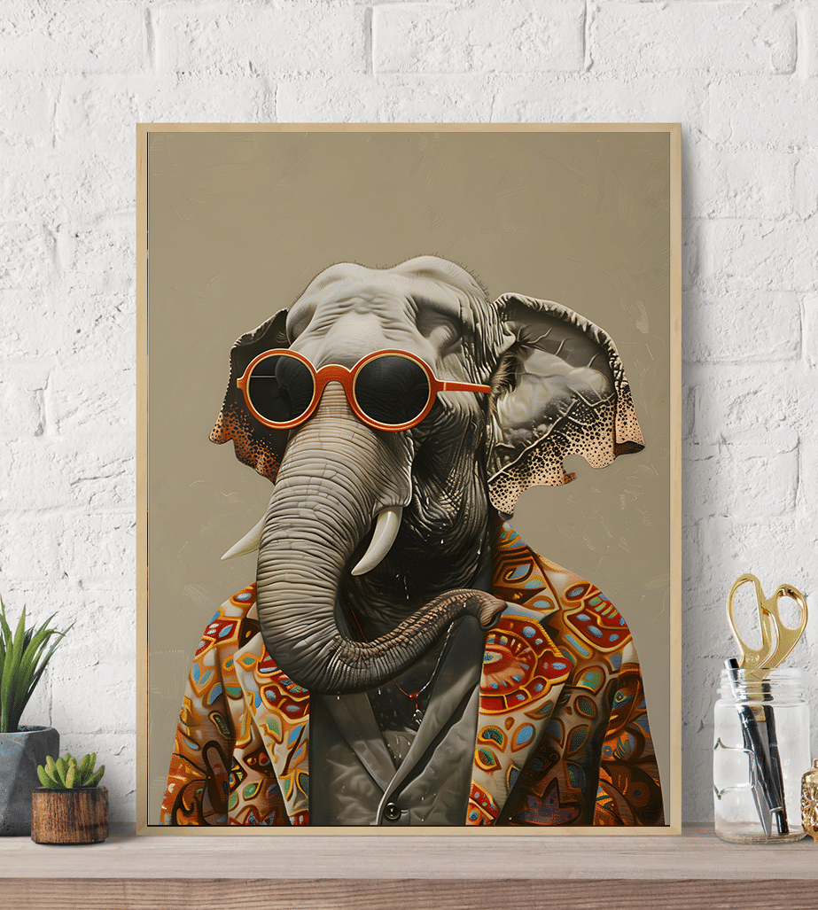 This canvas wall art is a whimsical throwback to the vibrant 70s, featuring an elephant who's all about peace, love, and bell-bottoms. The gentle giant is decked out in iconic round sunglasses and a psychedelic-patterned shirt that captures the era's spirit of colorful expression and individuality. The elephant’s wise and peaceful demeanor shines through, enhanced by the funky fashion it's adorned in, creating a playful contrast that's sure to be a conversation piece. Perfect for adding a dash of retro cool to your home decor, this piece of art embraces the harmony between the natural world and human creativity. It’s an ideal choice for anyone looking to infuse their interior design with a sense of fun, artistry, and a touch of nostalgia.