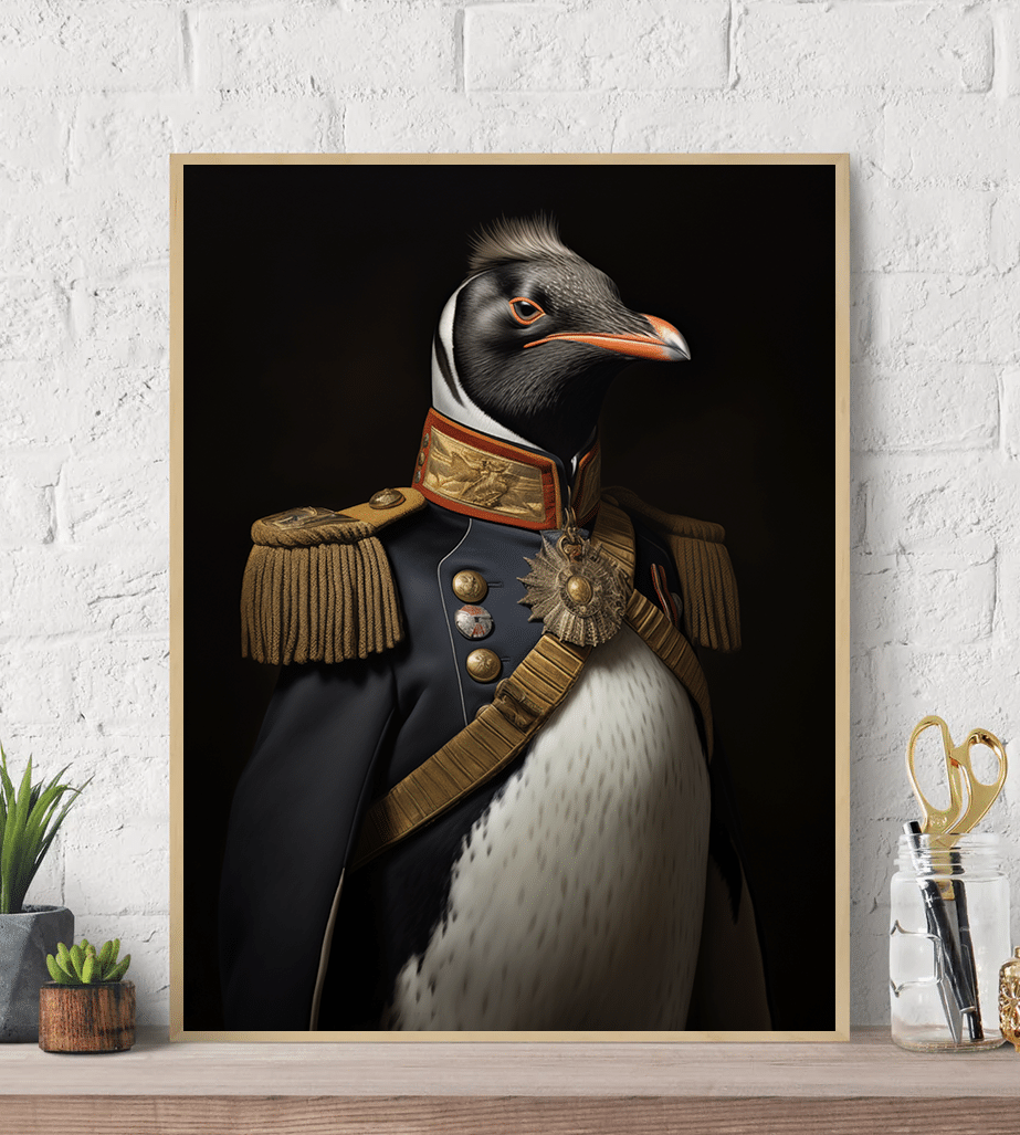 This canvas art print features an elegant Penguin attired in a formal military uniform, blending the charm of arctic wildlife with the grandeur of ceremonial dress. The penguin's poised demeanor and striking color contrast make this wall art an adorable yet dignified addition to any home decor. Perfect for those who love canvas wall art with an amusing twist, this piece adds a dash of playful formality to any room's interior design, offering a unique and delightful visual statement.