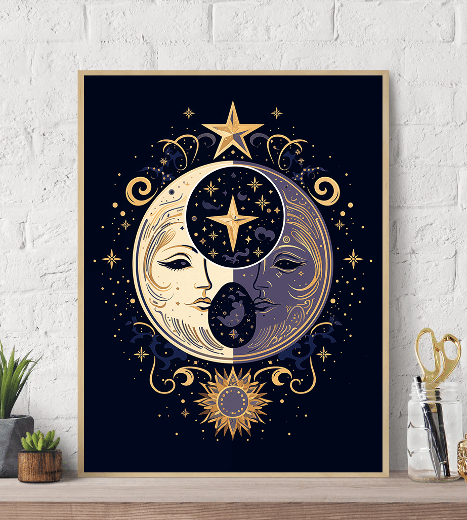 This canvas art captures the harmonious dance of celestial bodies in a captivating and mystical composition. The yin and yang of night and day are beautifully represented through a stylized portrayal of contrasting faces within a circular motif, suggesting the balance of the universe. The surrounding elements, including stars, the sun, and ornate patterns, add to the cosmic allure of the piece.